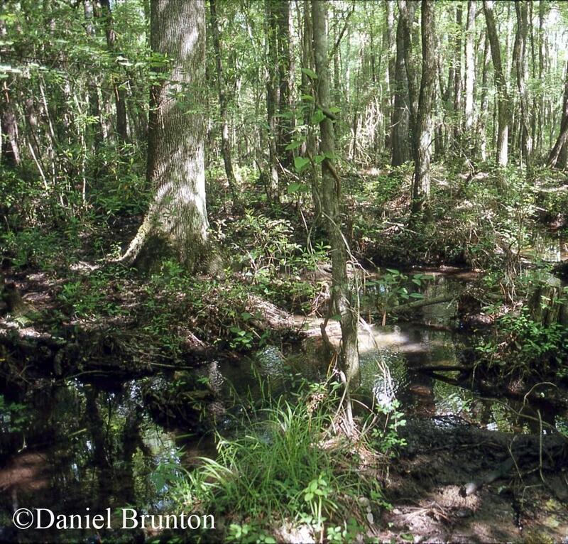 Shallow, flowing water of deeply shaded streams through swamps, with few or no associated plants.