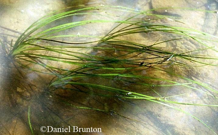 Perennial herb arising from a round rootstock and forming clumps in flowing water. The rootstock (corm) is nearly round, with two lobes. The leaves arise from directly from the corm and are up to 18 inches (45 cm) long, bright green fading to pale green at the base, flexible, with an expanded base, tapering tip, 4 cross-walls, and single midvein. Spores are produced in a sporangium, a small, brown-streaked chamber in the leaf base, with a translucent membrane (velum) covering approximately 30% of the chamber opening. Dozens of tiny female spores (megaspores), approximately 0.6 mm across, may be seen with 10 - 20x magnification; these are white with brown streaks and covered with a densely congested pattern of narrow, interconnecting ridges. Light gray, dust-sized male spores (microspores) are produced on separate leaves but are indistinguishable without much higher magnification.