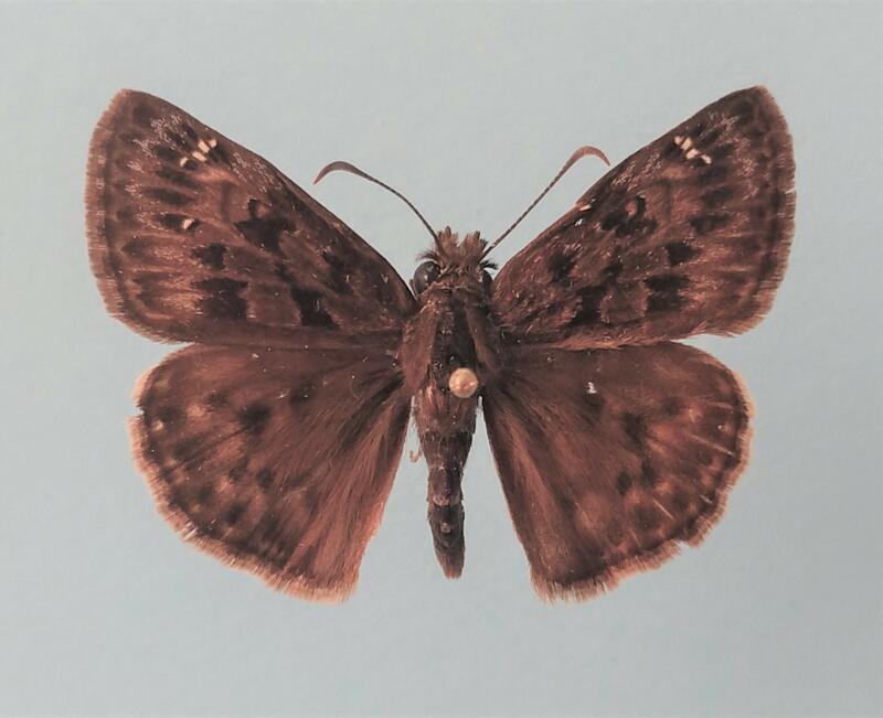 Erynnis martialis is appropriately named the Mottled Duskywing. The forewing has significant scattered dark patches on a medium brown background which makes it one of the more easily identifiable of the Duskywings. The hindwings also have prominent irregular bands of dark spots (see photo above). The wingspan (2.5 to 3.3 cm) is also a bit smaller than the other species (baptisiae, juvenalis, horatius) with which it might be confused. With duskywings, the adults always sit with the wings open, so the observer will see the upperside of the wings. and therefore be able to see clearly the diagnostic markings.