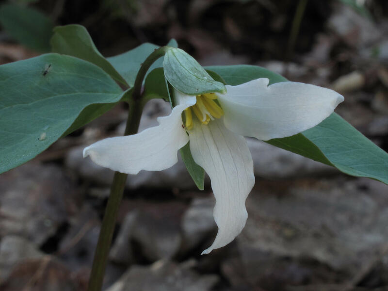 Trilliums are perennial herbs that send up stems, leaves, and flowers in early spring, after temperatures have risen but before the forest canopy has leafed out. After flowering and fruiting, the aboveground plant disappears, persisting through the late summer, fall, and winter as an underground rhizome. Seeds shed in the summer germinate the following spring and, within a year or two, send up a single, spatula-shaped seed leaf (cotyledon) for one year’s growing season. The next year, a true leaf is produced and, in subsequent years, three-leaved plants appear. After 5 - 7 years (possibly fewer in the Coastal Plain), the plant produces a flowering stalk. Trillium seeds have small, fat-rich appendages called elaiosomes that are appealing to ants, yellow jackets, and other wasps, which carry the seed back to their nests, inadvertently dispersing the trillium seeds. Seeds are dispersed longer distances when the fruits are eaten by other animals such as deer and woodchucks. Some seeds are left where they fall if the elaiosomes are eaten off by beetles, resulting in clusters of seedlings near the parent plant. Some trilliums produce clonal rhizome offshoots that develop into immature plants that are eventually separated from the parent plant as the rhizomes decay. Mature trillium plants are very long-lived, perhaps living more than 100 years, but since the rhizome continues to lengthen and produce shoots on one end, while the other end decays, it is impossible to determine age from rhizome growth scars.