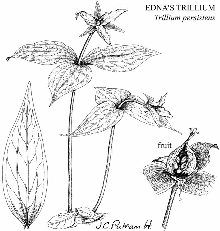 Trillium persistens (Persistent Trillium, Edna's Trillium) occurs in mixed Pine-Hemlock-hardwood forests in ravines or along streams in northeast Georgia, often with rhododendrons or in lowbush blueberry thickets. For more information, see: https://www.georgiabiodiversity.org/portal/profile?group=plants&es_id=19927