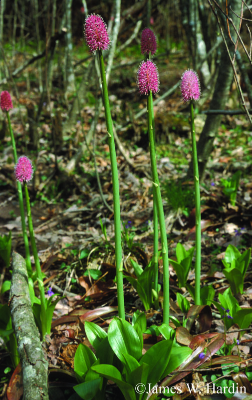 Swamp Pink is a perennial herb that overwinters as a rosette of reddish-brown leaves. New leaves appear in the early spring, shortly before the flowering stalk emerges and longates, and continue to enlarge during the spring and summer. Contractile roots counteract the strong upward growth of the flower stalk, holding the plant firmly in the substrate. Swamp Pink reproduces primarily by the spread of rhizomes; less than 15% of plants in a Swamp Pink population flower in a given year. If a plant is going to flower the following spring, the flower cluster will appear as a large button in the center of the overwintering rosette.