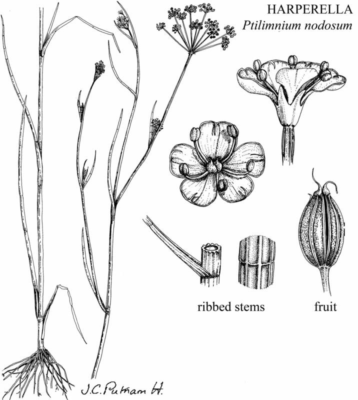 Ptilimnium nodosum (synonym Harperella nodosa) is an annual herb with erect stems up to 3 feet (1 m) tall; the height of plants varies greatly depending on rainfall. Leaves are up to 12 inches (30 cm) long near the base of the plant, becoming shorter up the stem, alternate; they are hollow tubes, except for cross-partitions, and taper to a point. The flowers are in flat-topped clusters (umbels) composed of 5 - 15 smaller umbelets. The flowers have 5 tiny, white petals, sometimes curved up and strongly inward over the center of the flower; the tips of the stamens (anthers) are dark pink. The fruits are oval with 6 - 10 ribs. All parts of the plant smell faintly of dill.