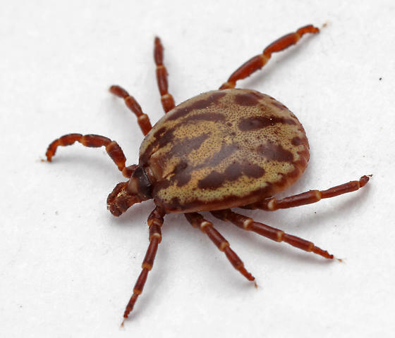 A large tick (the largest tick species in North America) especially in the adult stage. Members of the genus Amblyomma have an ornate (patterned) dorsal scutum. Adult females of A. tuberculatum have a cream colored scutum laterally with a wide brownish central line, whereas males have a cream colored scutum (which covers most of the dorsal surface) with numerous brown marks. Nymphs and larvae are progressively smaller and have an almost entirely brown scutum. Blood-engorged females can be the size of a large marble.
